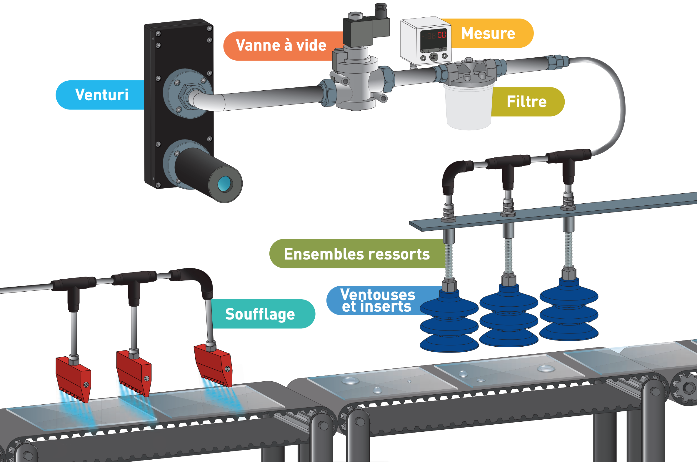 La préhension par le vide assure la prise d’une multitude d’objets sans les endommager et en permettant de grandes cadences de vacuo-transfert. La manipulation par le vide est une technique très largement utilisée dans l’industrie manufacturière (automobile, agroalimentaire, plasturgique, pharmaceutique, conditionnement, imprimerie, …). Elle consiste à saisir un objet - qui peut être une tôle, une feuille de papier, un produit fini ou un aliment - à l’aide de ventouses ou de pinces, pour le transporter d’un poste de travail à un autre ou le disposer dans son emballage par exemple. Les ventouses sont intégrées à un dispositif de manutention et le vide est assuré par un circuit piloté par des automatismes et alimenté par des générateurs de vide, appelés aussi venturis ou éjecteurs.