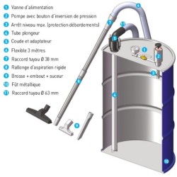 Le système d’aspiration pneumatique POMPE 90 F utilise le principe du venturi pour aspirer des liquides par dépression.